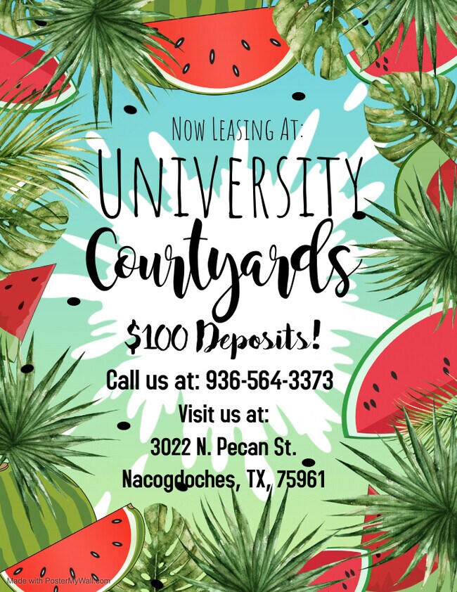 Get University Courtyards Apartments can be contacted at 936 564-3373. University Courtyards Apartments-Nacogdoches save favorite. Send Message 936 585-6281.